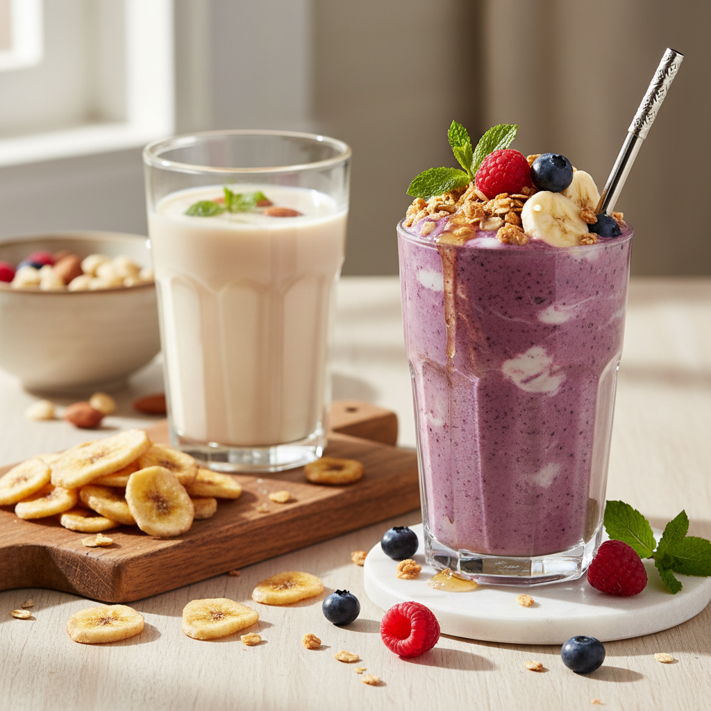 اگر در طول روز امکان درست کردن اسموتی ندارید، می‌توانید چند تکه موز خشک را داخل لیوان شیر بادام یا شیر نارگیل ریخته و ۲ دقیقه صبر کنید تا بافت نرمی پیدا کند.